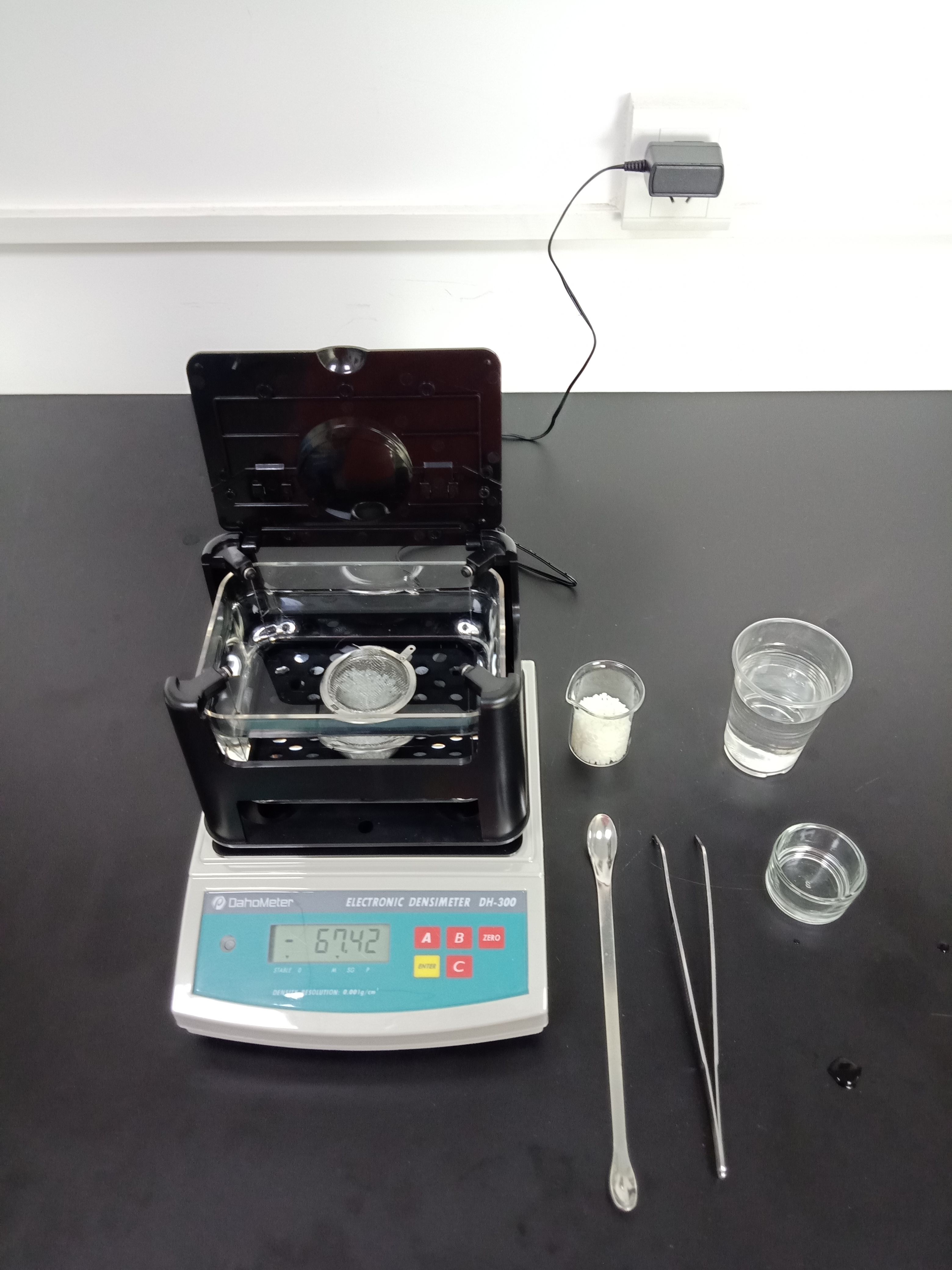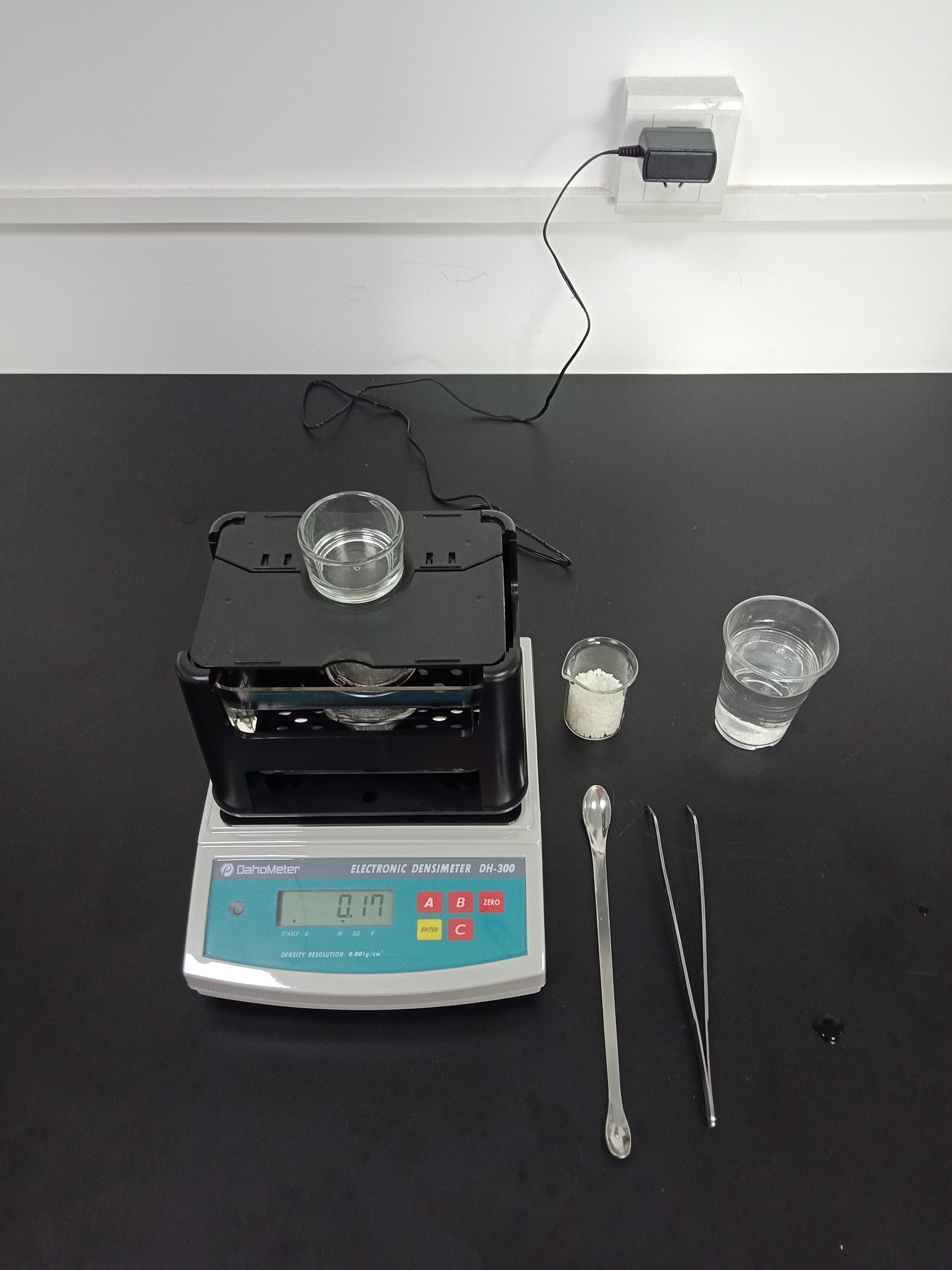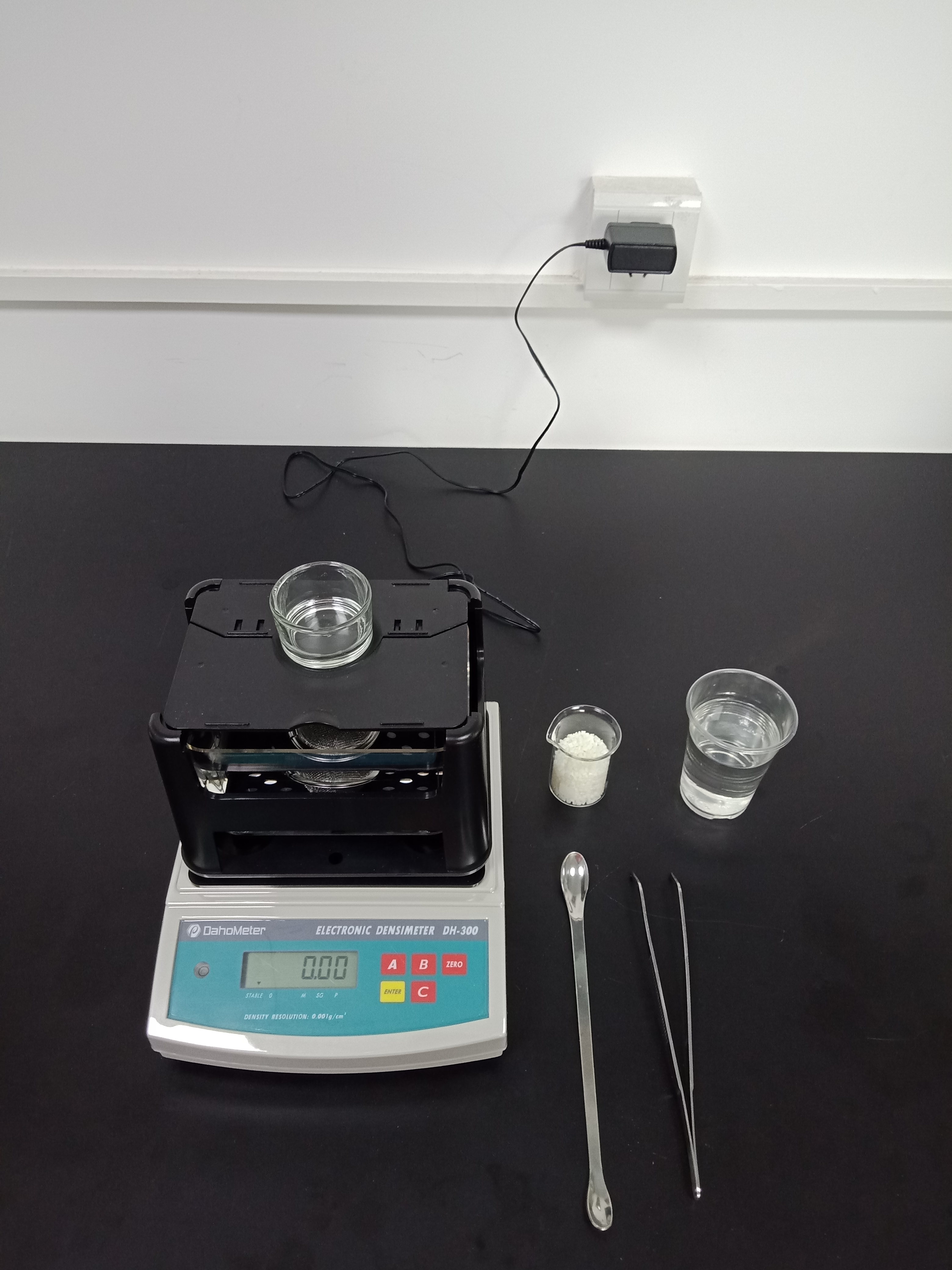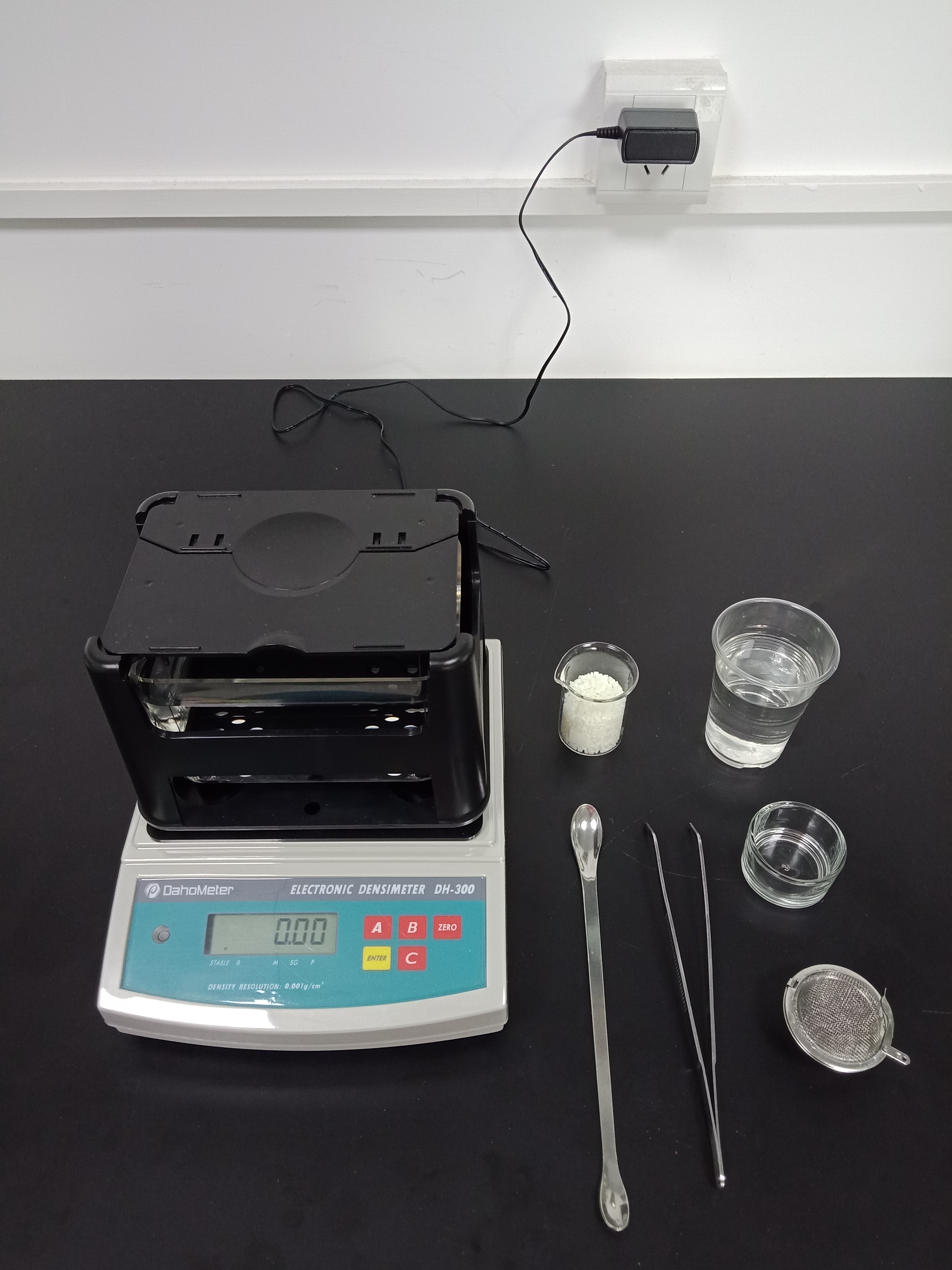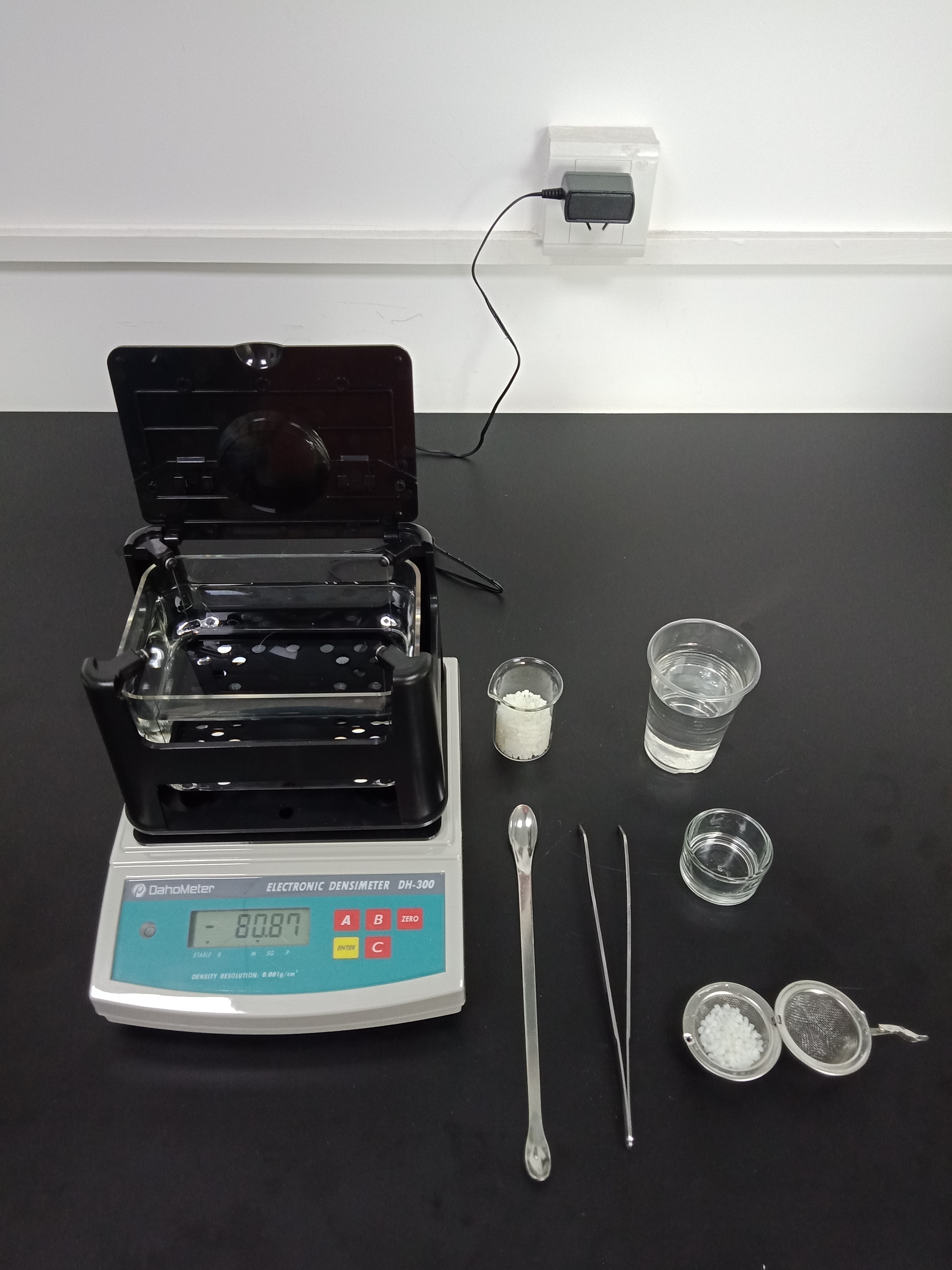 1,準備好測試儀器DH-300,測試樣品和測試工具小玻璃杯一個,小網球一個,鑷子一把,勺子一個,裝滿酒精的杯子一個