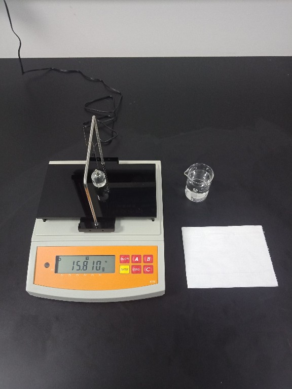 1, 用50ml的燒杯裝50ml的純凈/蒸餾水,準備好測試用的玻璃/不銹鋼砝碼(演示操作中用的是玻璃砝碼)和掛鉤一個,如下圖: