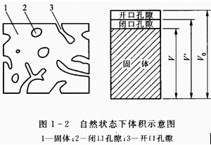 V0—— 材料在自然狀態下的體積,包括材料實體及其開口孔隙、閉口孔隙,見圖1-1,m3或cm3。