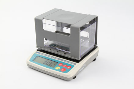 ⑦將用酒精浸泡過的產(chǎn)品放入水中測水中重量,觀察是否有氣泡產(chǎn)生,按ENTER鍵記憶,顯示密度值。