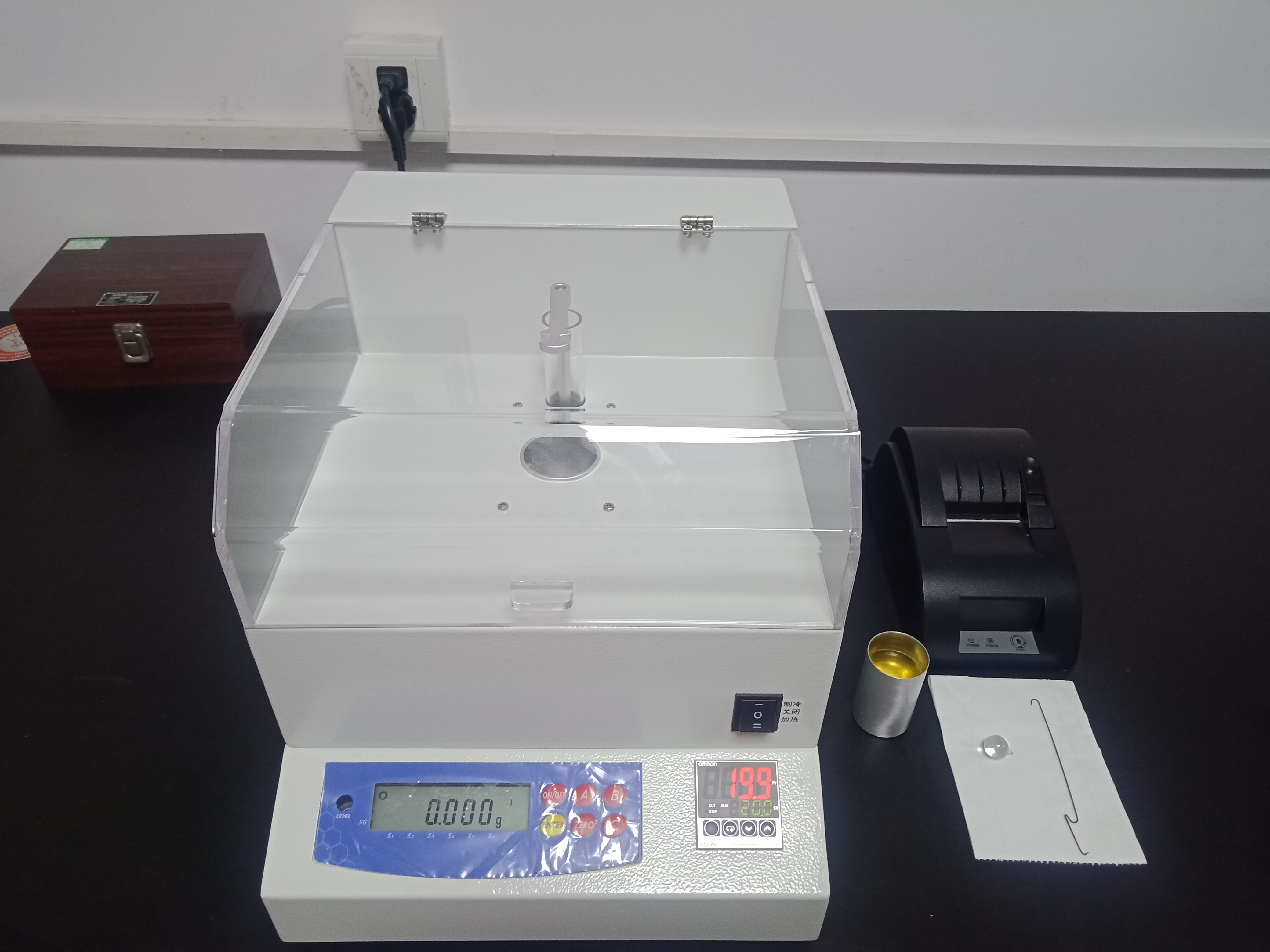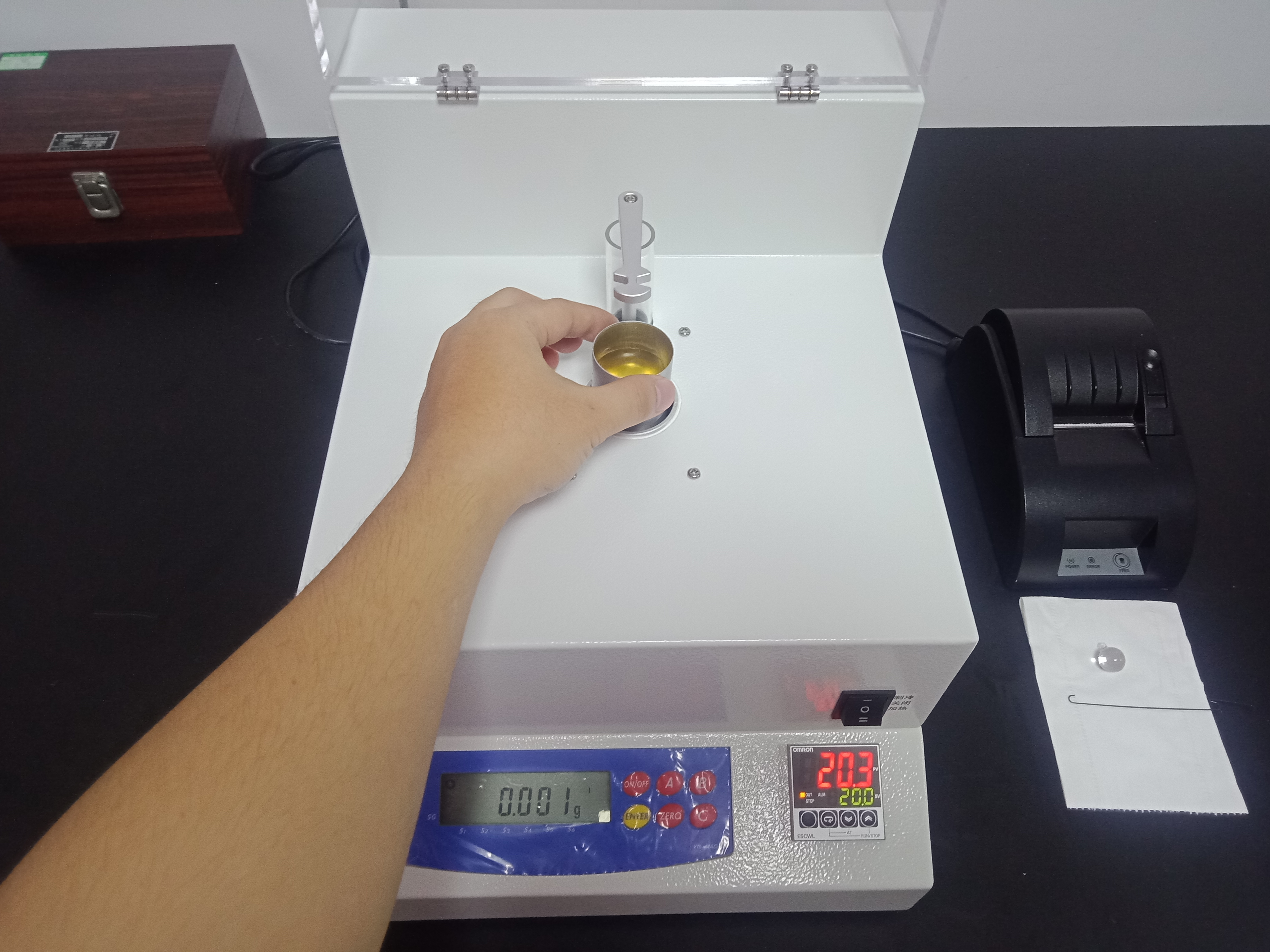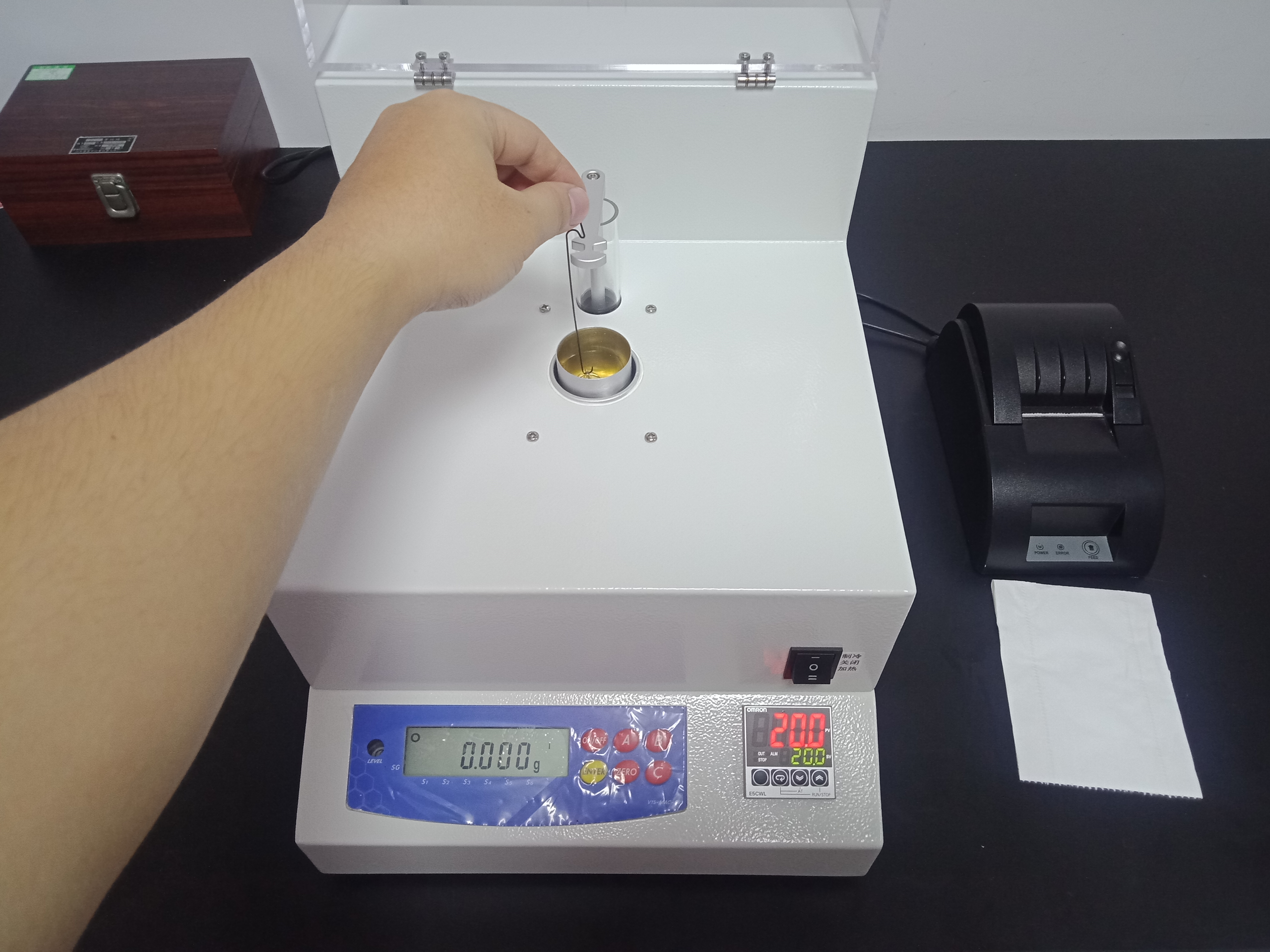 3,恒溫到20℃后,將已經(jīng)恒溫好的掛鉤和砝碼掛在測(cè)試支架上,砝碼完全浸沒(méi)在待測(cè)溶液中,然后按ENTER鍵,儀器會(huì)將雙氧水(過(guò)氧化氫)的濃度值顯示在屏幕上,打印機(jī)會(huì)將測(cè)試的詳細(xì)數(shù)據(jù)打印出來(lái)
