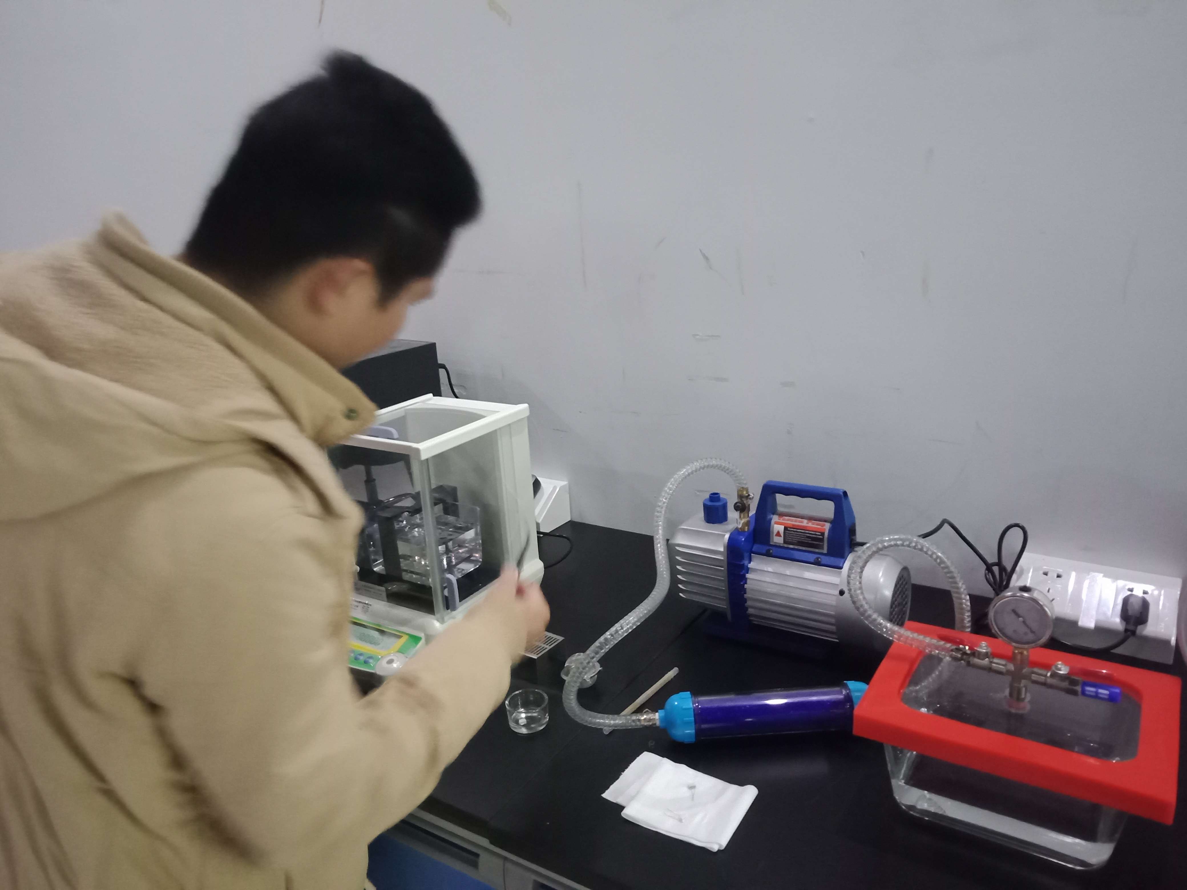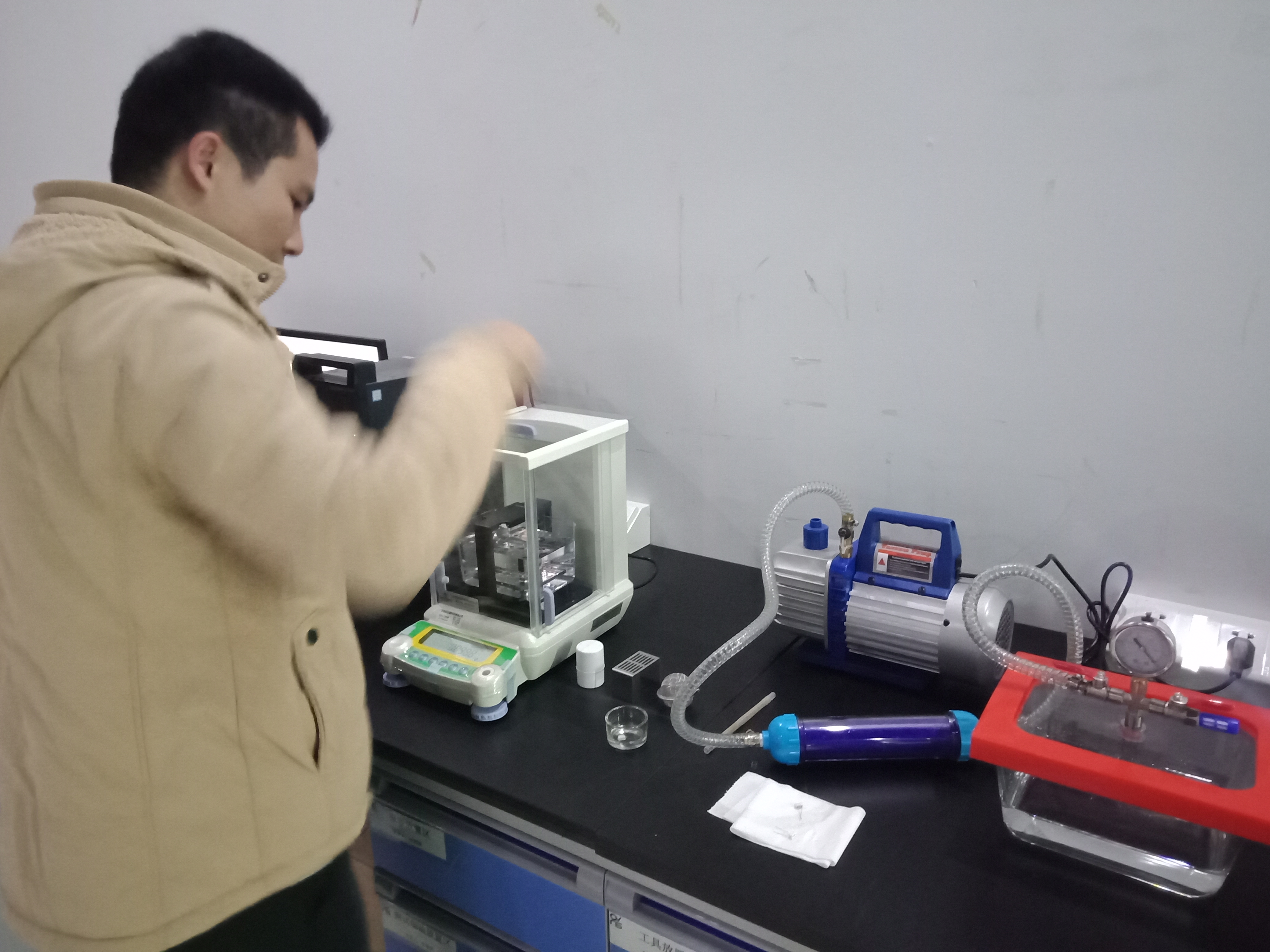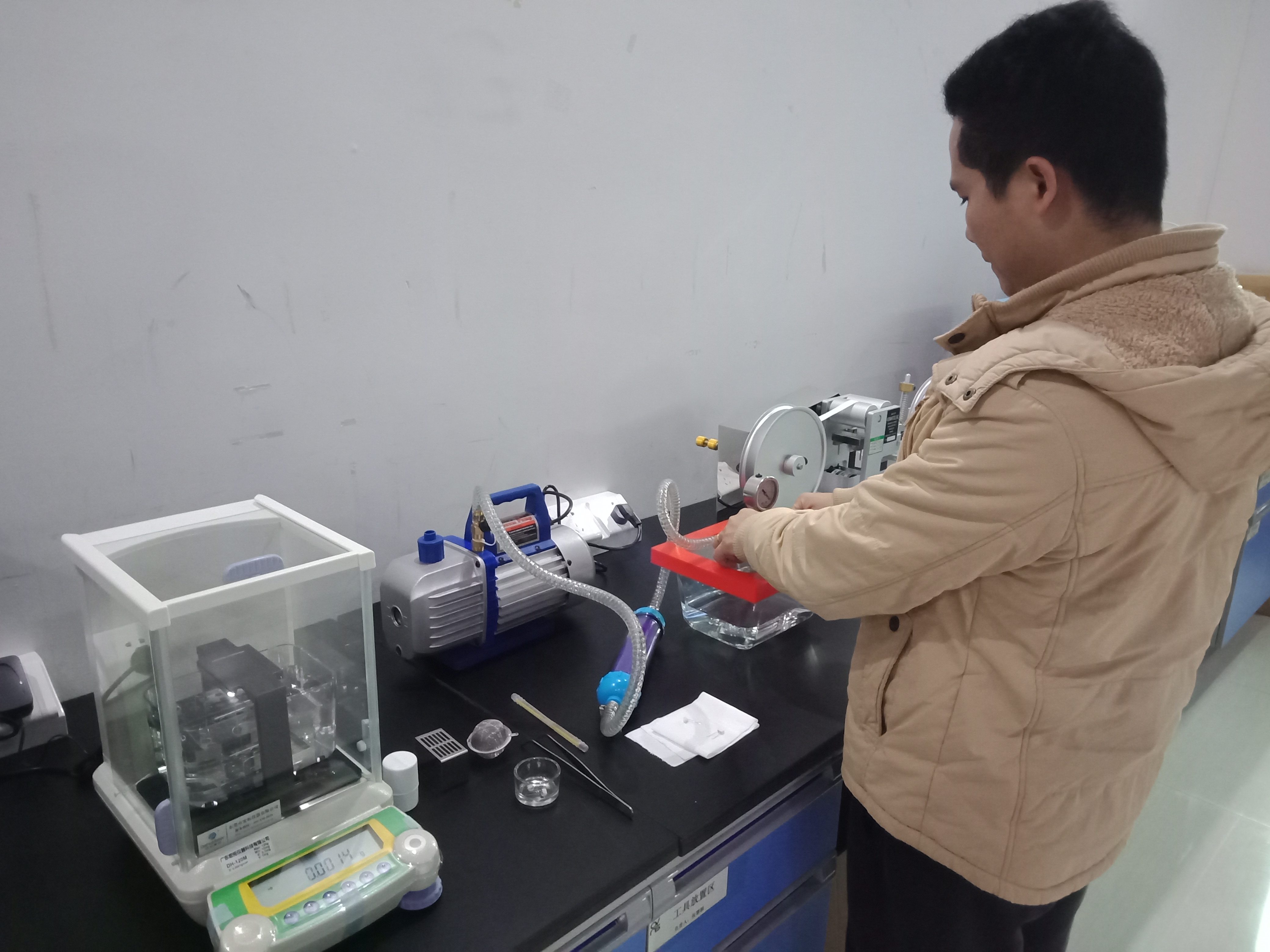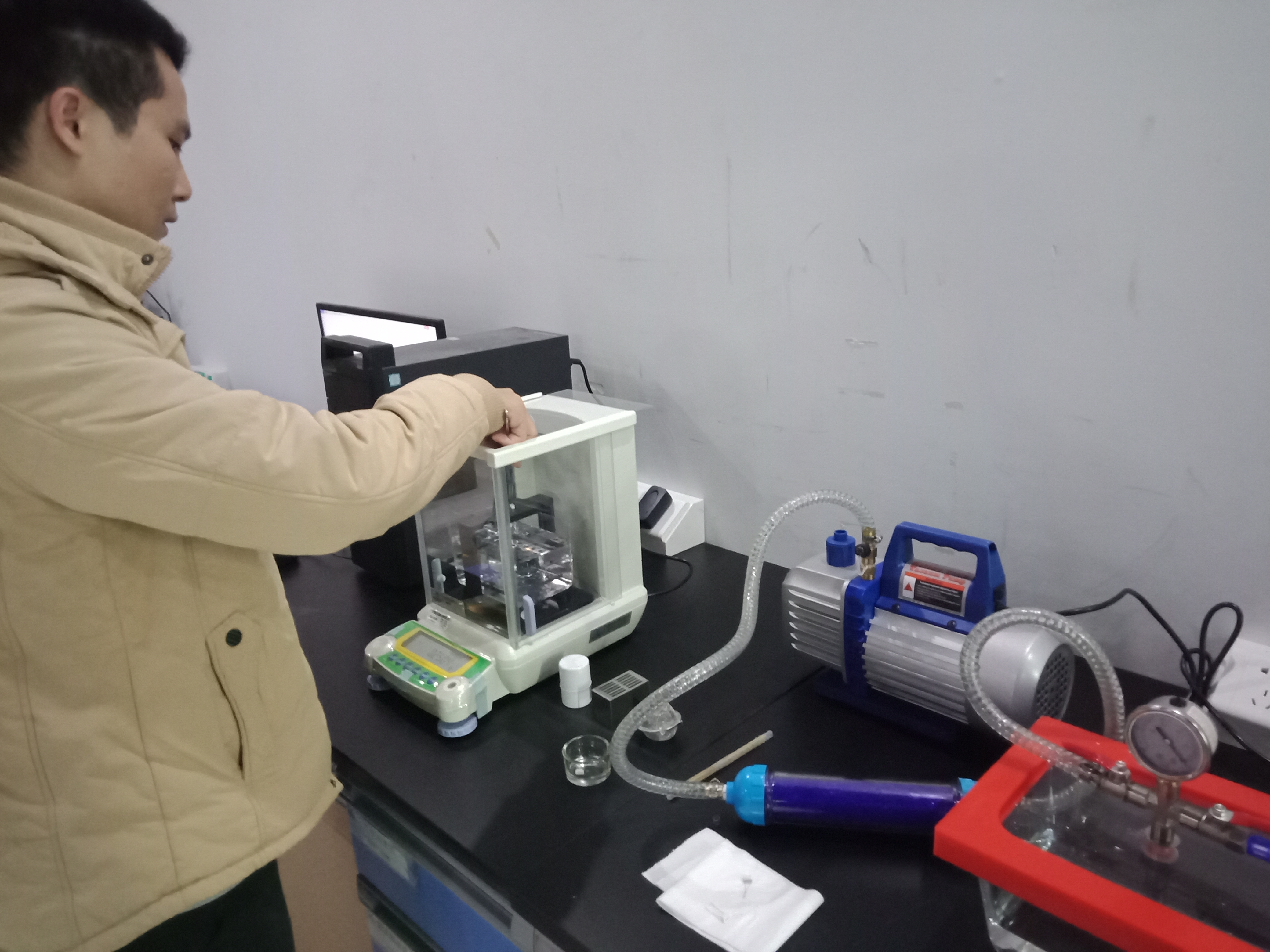 2020年12月17號,深圳傲世威科技有限公司與廣東宏拓儀器科技有限公司首次合作,購買了用于測試精密陶瓷孔隙率和密度的高精度密度與孔隙率測試儀DH-120M,此次購買的DH-120M高精度密度與孔隙率測試儀主要用于測試電子煙成品里的精密陶瓷配件,為了更準確的測試精密陶瓷的孔隙率,DH-120M還搭配使用真空機和真空飽和水槽,真空機和真空飽和水槽主要作用是讓精密陶瓷進行水飽和處理,通過DH-120M高精度密度與孔隙率測試儀計算出精密陶瓷樣品的有效孔隙率和吸水率。