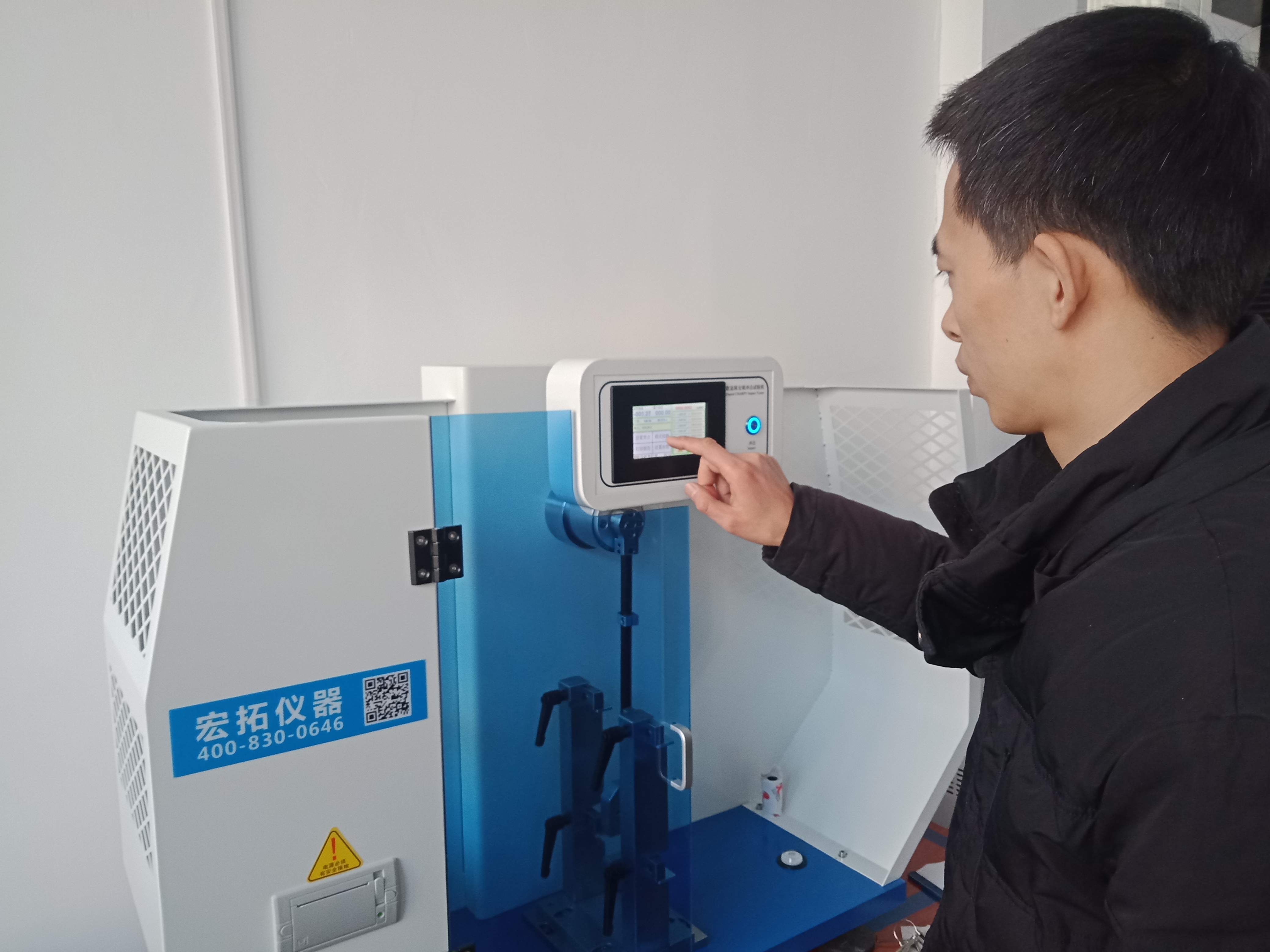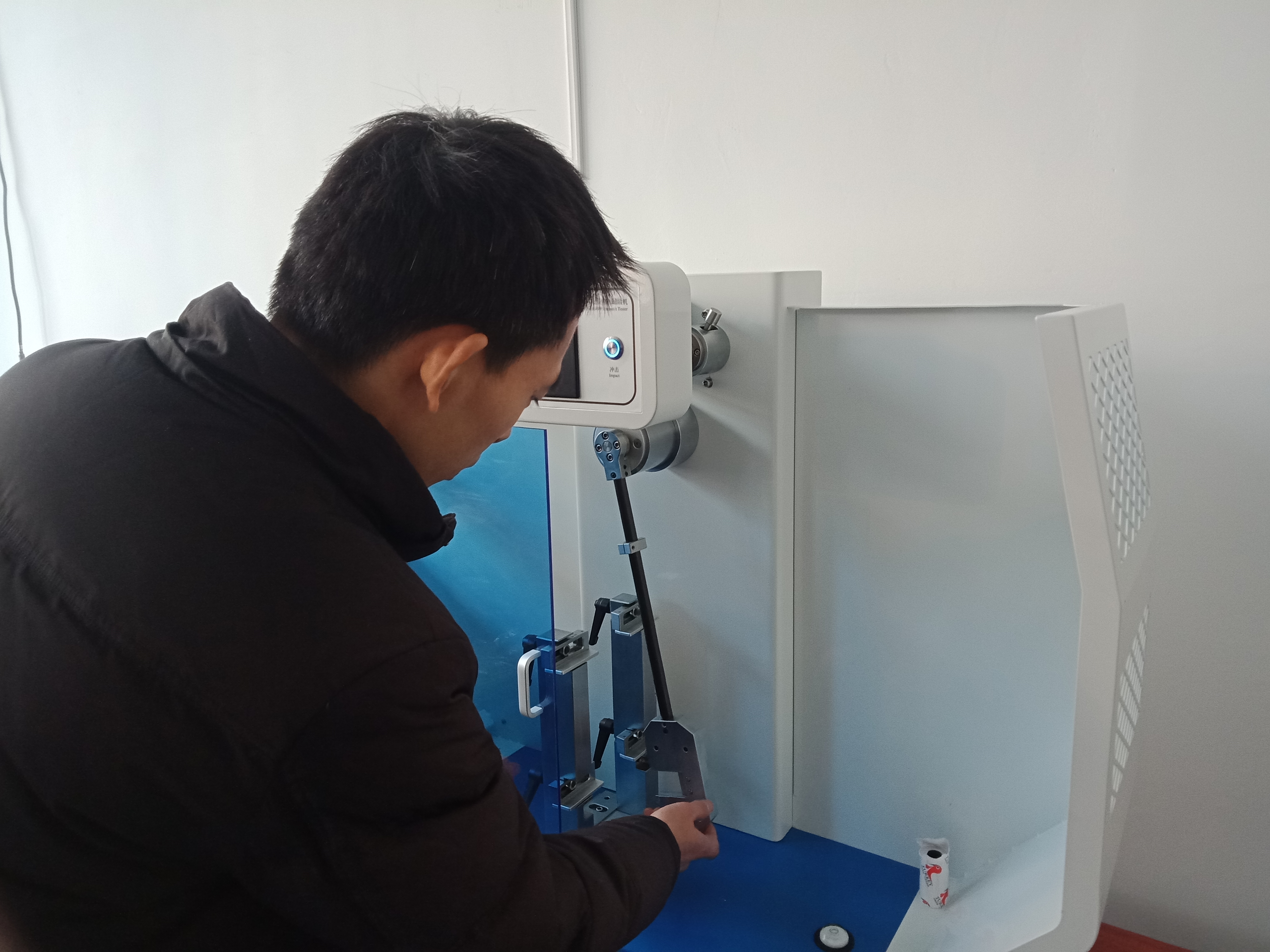 寧波聚嘉實驗室工作人員正在使用簡支梁沖擊試驗機進行樣品的沖擊試驗